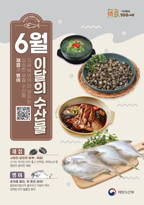 해양수산부가 정한 6월의 수산물은 재첩 과 병어 입니다.