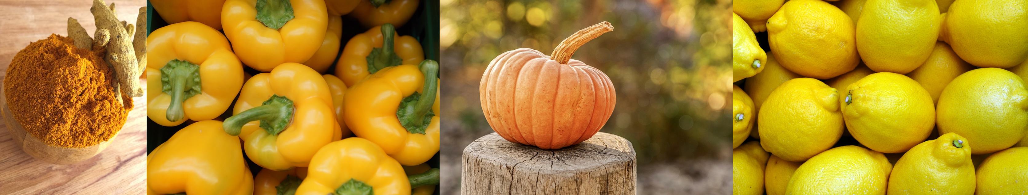 노란색 식품으로는 카레의 원료인 강황, 살구, 노랑파프리카, 누런호박, 유자, 파인애플, 망고, 귤, 감, 황도 등이 있습니다.
