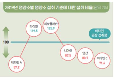 2019년 조사에 의하면 우리나라 사람들은 비타민A, 엽산, 나이아신, 비타민C를 권장 섭취량보다 비교적 적게 섭취하고 있다고 합니다. 우리가 흔하게 생각하는 비타민 들인데 생각보다 섭취량이 많지 않은 것에 놀랍습니다.