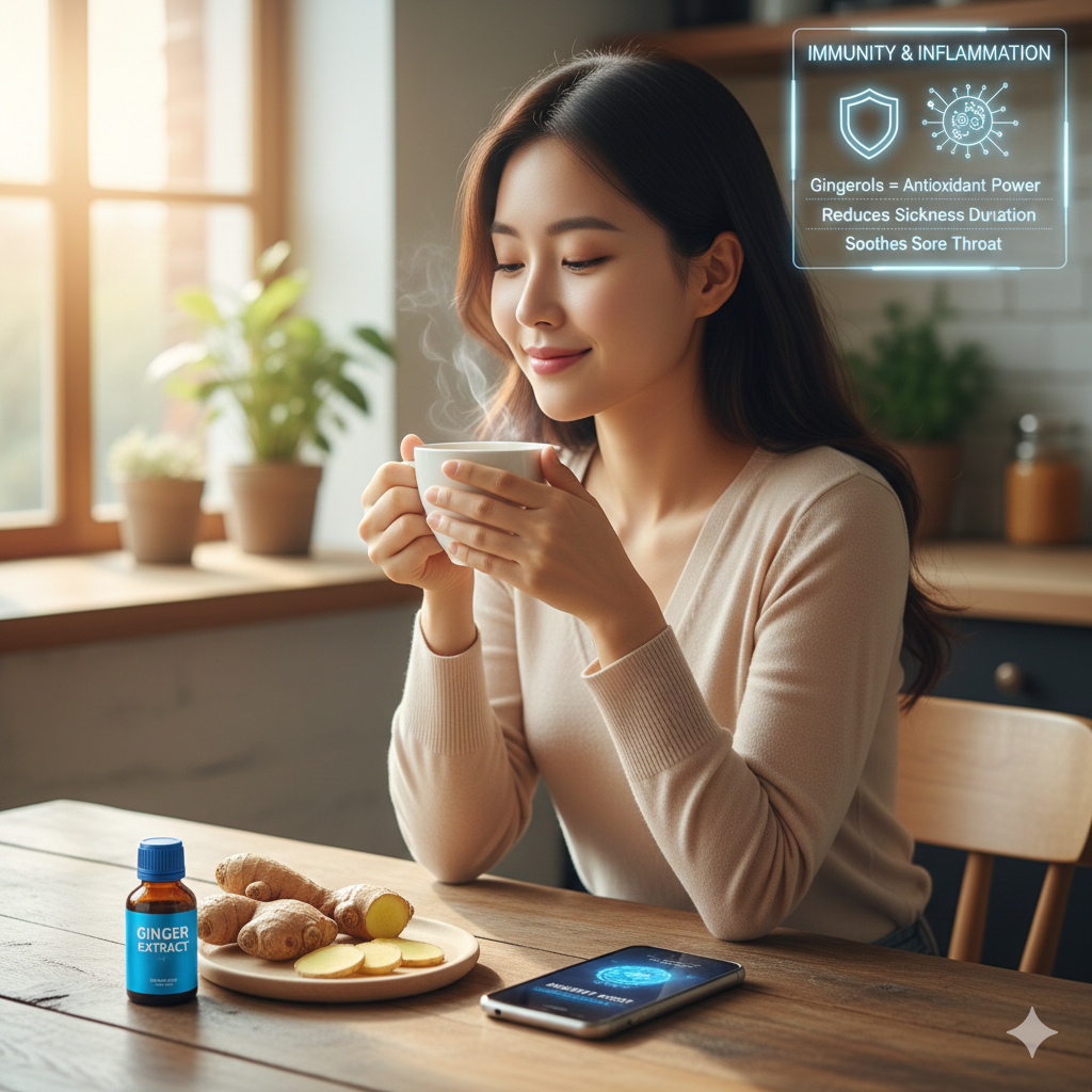 생강은 강력한 항산화 성분들을 풍부하게 함유하고 있어 체내 유해한 활성산소를 제거하고 만성 염증 반응을 줄이는 데 기여합니다. 이는 감기나 독감과 같은 바이러스성 질환으로부터 우리 몸을 보호하는 면역 체계를 강화하는 효과로 이어집니다. 감기에 걸려 목이 칼칼하고 몸살 기운이 있을 때 따뜻한 생강차 한 잔을 마시면 인후통 같은 국소 염증을 가라앉히고 질병의 기간을 단축하는 데 실질적인 도움이 됩니다.