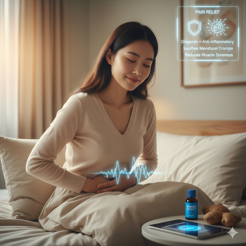 여성 건강에 특히 유익한 생강의 항염 효과는 생리통(월경통)을 줄여주는 데 뛰어납니다. 연구에 따르면 생강 보충제를 하루 세 번 복용하는 것이 비스테로이드성 항염증제(NSAIDs)인 이부프로펜과 유사한 수준의 통증 완화 효과를 보였다는 보고도 있습니다. 이는 생강이 통증과 염증을 유발하는 프로스타글란딘 생성을 억제하기 때문으로 추정됩니다. 또한 과다한 생리 출혈을 조절하는 데도 긍정적인 역할을 할 수 있습니다.