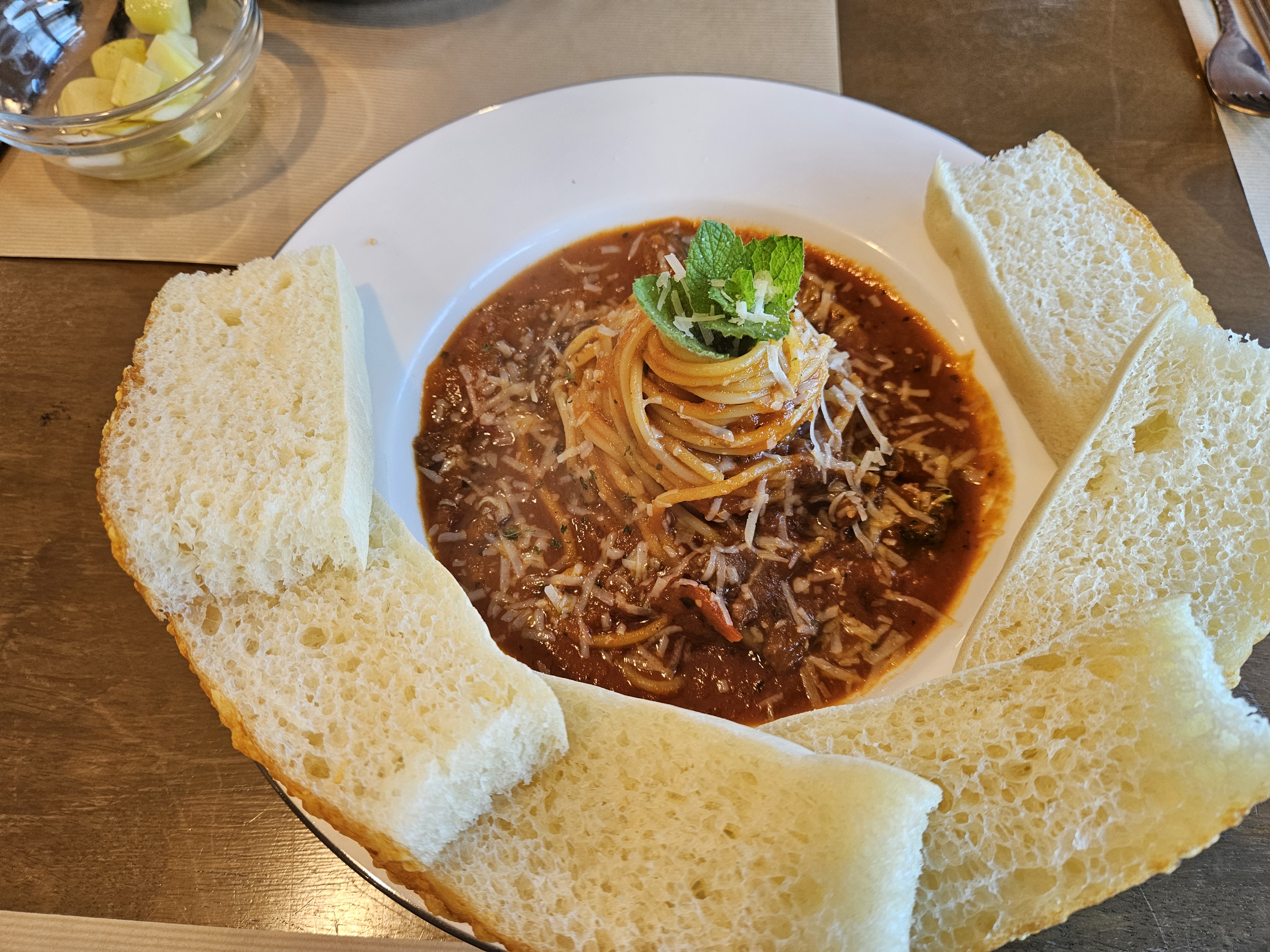 토마토 스파게티 는 소스가 진하고 재료가 풍성하게 들어가 맛있었어요.