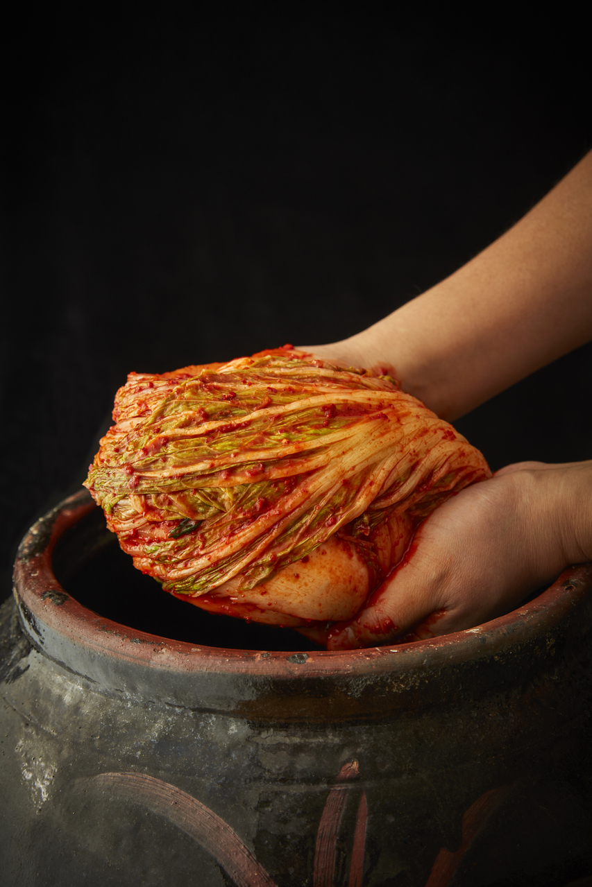 김치는 일반적인 발효식품과는 조금 다른특징을 가지고 있습니다. 대분의 발효 절임음식은 고농도의 소금이나 설탕에 채소를 바로 절이는 방법을 택하지만 김치는 배추를 10시간가량 소금에 절여 유해 미생물을 제거한 후에 소금기를 뺀 후에 각종 야채와 고춧가루등 조리료를 버무린 김치속 양념을 배추잎사이에 켜켜이 발라서 공기층 없이 잘 포갠 후에 발효를 유도하는 "복합발효방식"으로 제조됩니다. 이렇게 소금에 한번 절여서 다시 발효시킨 김치는 유해 미생물의 초기 생존을 막아서 유산균의 활동을 도와주고, 삼투압 작용에 의해 김치양념이 배추에 들어가 맛있는 맛성분과 물질 교환이 이루어 지면서 발효가 아주 잘 이루어집니다. 이러한 발효방식은 배추 특유의 아삭한 질감을 유지시키면서 맛이 잘 어울러 지게 합니다.