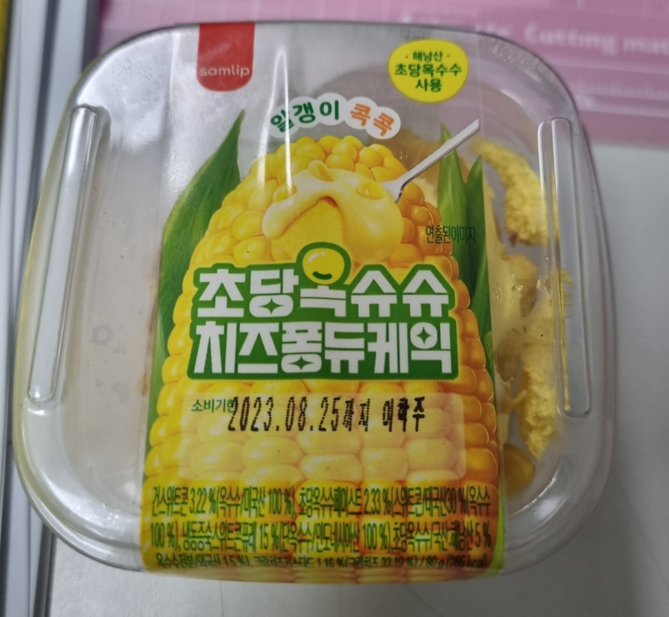 카스테라빵과 노란색 크림, 그리고 초당옥수수알이 콕콕 박혀 있어요